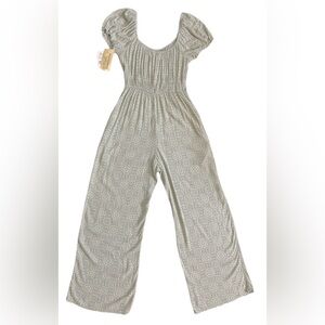 Step into effortless boho cottagecore style with this brand new with tags (NWT) Rewind Junior's size Small jumpsuit! This light olive green and white one-piece features a geometric repeating pattern, perfect for laid-back summer days, festivals, beachwear, or weekend getaways.