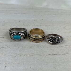 1 Gold tone ring w/ 2 blackened stripes. 1 silver tone ring in shape of leaves wrapping around finger. 1 silver tone ring w/ 6 blackened stripes & turquoise dyed Howlite stone