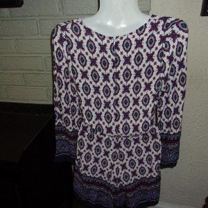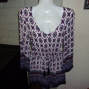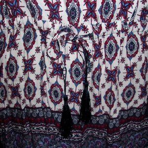 NWOT, never worn V neck. long sleeve Red, white and blue floral pattern Adjustable waist tie front with tassels Zipper closure back.