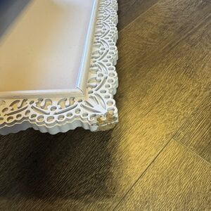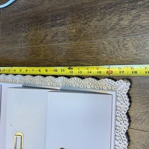 Approximately 25 inches long and 18 inches in height. Boho Shabby Chic Detailed engraved wood boarder. Pin Board on one side and 2 mail holders on the other. 2 corners have little damage and can be viewed in last 2 pics. Just need a little love to fix.