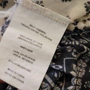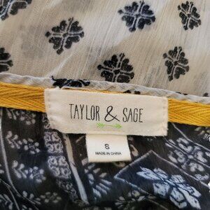 This Boho semi-sheer Blouse by Taylor and Sage is a size small, featuring a black and white print design. The blouse is flowy with long sleeves and is made of polyester, perfect for adding a touch of Bohemian style to your wardrobe.