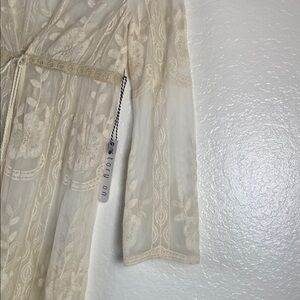 ✨ Breathtaking boho layering piece! Sheer ivory kimono cardigan with beautiful floral and leaf embroidery throughout. Lightweight and romantic — perfect for festivals, summer outfits, or even as a beach cover-up.
