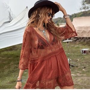Boho Sheer Mesh Lace Deep V Neck Beach Swim Cover Up