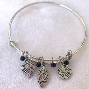 One silver bangle with three silver Filagree leaf shaped charms, one with an elephant and the others with decorative motifs. Tiny black beads alternate with the charms.
