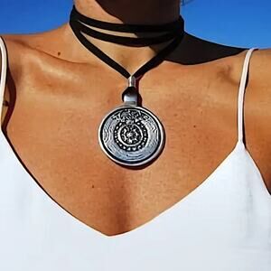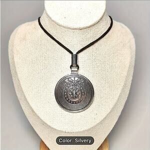 Boho round pendant silver leather code necklace. Can be customized to any size.