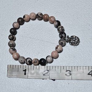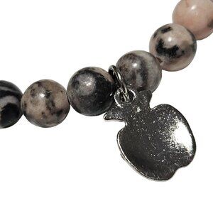 This bracelet combines natural stone beads with a rhinestone apple charm, offering an elegant accessory that complements both casual and formal attire.