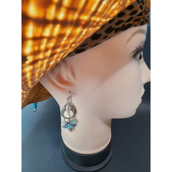 Beautifully detailed teardrop earrings with natural blue and green mineral chip accents. These dangling earrings feature etched silver-tone metal and stone bead drops for a unique, earthy statement look. Lightweight and perfect for boho, festival, or everyday wear.
