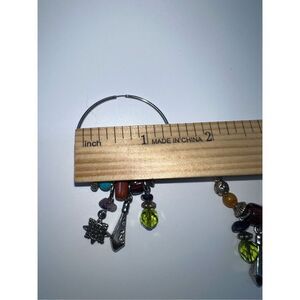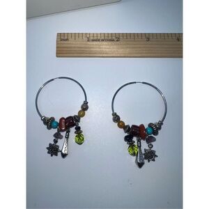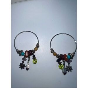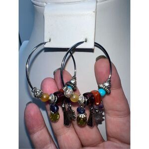 Boho Silver Tone Charm and Stone Dangle Charm Hoop Earrings