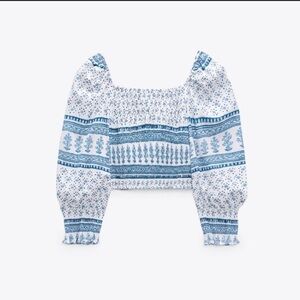 Boho Smocked Waist Paisley Patterned Blue and White Peplum Bubble Sleeve Croptop