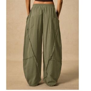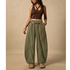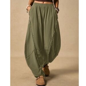 Boho Solid Stretchy waist Pockets Frayed Detail Harem Pants