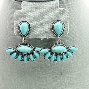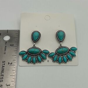 Keywords: drop earrings, turquoise earrings, faux turquoise jewelry, silver tone earrings, post back closure, women's earrings, Southwestern style, new with tags, NWT earrings, ethnic jewelry, regional style earrings, faux turquoise jewelry, fashion earrings, statement, chunky, boho, southwestern, dangle, fan, teardrop, beaded