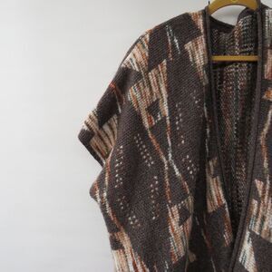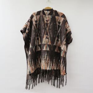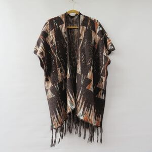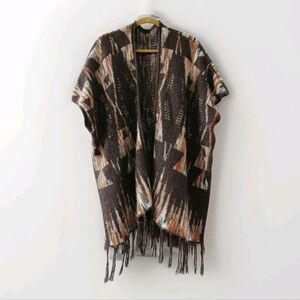 Boho Southwestern Women Size Large Open Front Gray Neutral Beige Fringe Poncho