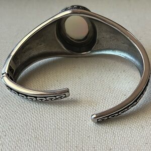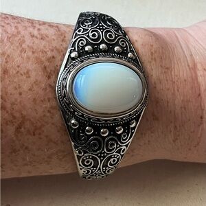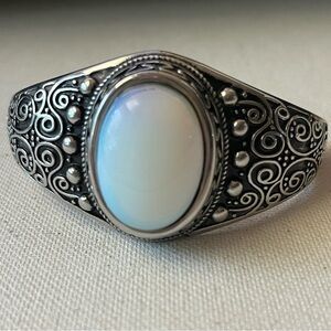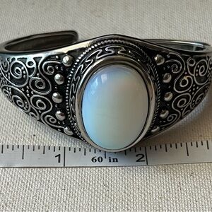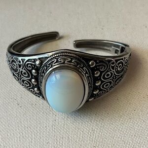 Add a touch of vintage boho charm with this eye-catching silver-tone cuff bracelet, featuring an ornate swirl and dot pattern and a glowing faux moonstone center. The bracelet is hinged and adjustable, fitting most wrists comfortably. Perfect for festivals, everyday wear, or as a unique gift!