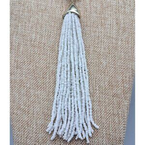 Enhance your boho style with this stunning long asymmetrical statement necklace. Featuring ivory faceted beads with a light AB wash, seed bead tassel pendant, and a gold-tone rolo chain, this piece is perfect for any occasion.