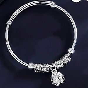 Boho Sterling Silver Resizable Ball Charm Bangle Bracelet