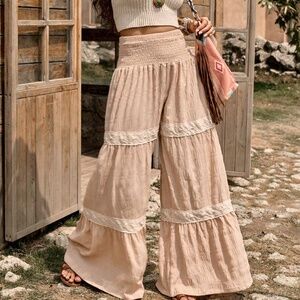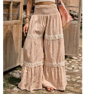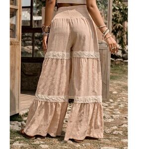 Boho Stretchy Waist Lace Detail Wide Leg Textured Pants