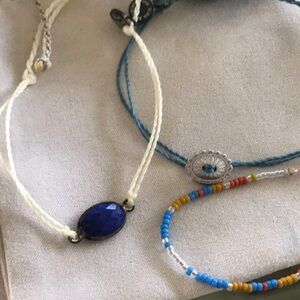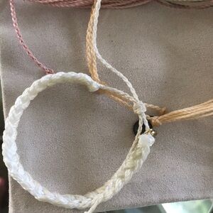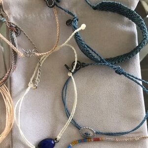 Set of 9 chic Pura Vida boho string bracelets in pink, blue, cream, and tan. Perfect for layering. Excellent condition.