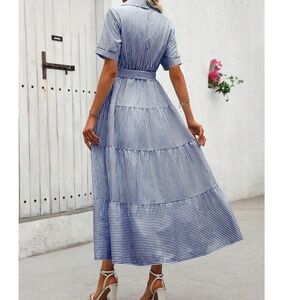 Boho Striped Butto Belted Short Sleeve Ruffle Hem Shirt dress