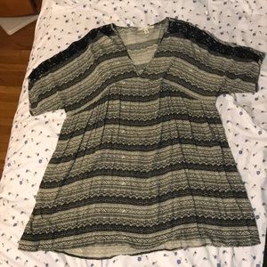 Black and Grey boho style mid-length dress. Empire waist (looks great with a belt!), boho pattern and lace on sleeves.