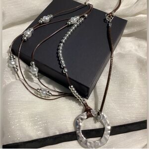 Multi-strand layered cord necklace featuring polished silver-tone beads, luminous faux pearls, and a bold asymmetrical silver-tone open ring pendant that anchors the entire look. Each strand is artfully spaced for graceful drape and visual balance, combining earthy textures with metallic elegance.