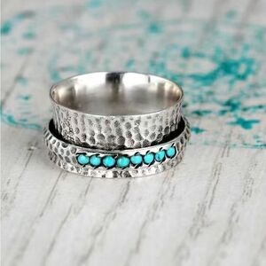 Boho Style Wide Ring Hammered Inlaid Turquoise Rotatable Design For Releasing