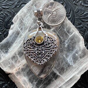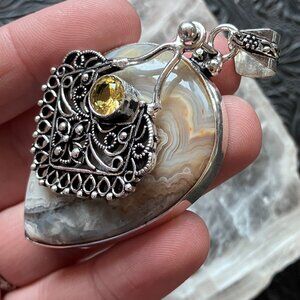 Pendant of a natural crazy lace agate crystal stone and faceted yellow citrine gem (may be lab created) inset in a boho styled swinging ornament, in a 925 silver plated frame.
