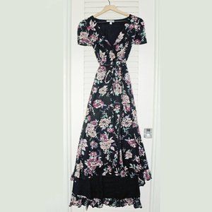 Beautiful long floral summer dress from Patrons of Peace. Never worn, excellent condition. Dress features wrap front and self tie at waist and exaggerated slit. Lined with a ruffled tier hem. 100% Cotton