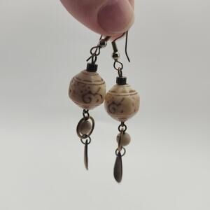 boho dangle earrings, swirl bead earrings, teardrop earrings, neutral earrings, beige jewelry, bohemian style, festival earrings, cottagecore jewelry, gold tone drop, everyday earrings