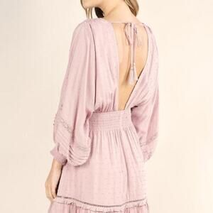 Boho Swiss Dot Crochet Accent Open Tassel Tie Back Womens Balloon Sleeve Dress S