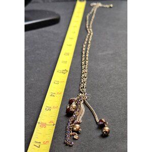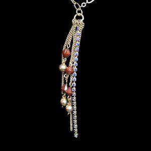 Boho Tassel Fashion Necklace Gold Brass Tone Brown Beads Blue Rhinestones 28"
