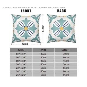 16 x 16. The bohemian decorative pillow cover with invisible zippers. Both sides with same blue floral printings as showed in picture. And NO pillow stuffing.