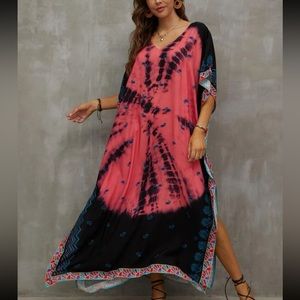 Boho Tie Dye Print Batwing Sleeve Slit Hem Maxi Dress