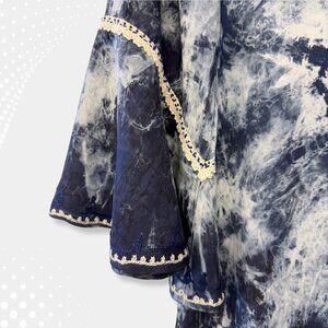 NEVER WORN! Make a statement with this stunning navy and white tie-dye tunic that doubles as a beach cover-up or casual boho dress. Featuring a relaxed fit, bell sleeves, and unique crochet lace trim detailing, this piece feels effortlessly free-spirited and artisan-crafted. The hand-dyed look gives it that one-of-a-kind, festival-ready vibe.