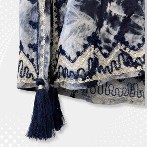 💙 Boho Tie-Dye Tunic Dress Cover-Up w/ Crochet Trim & Tassels | Navy White | XS