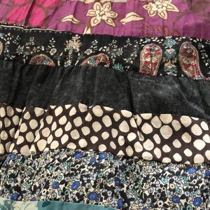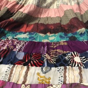 18 different cotton fabrics stitched in bands make this full skirt. Wide elastic waist. Gauze lining.