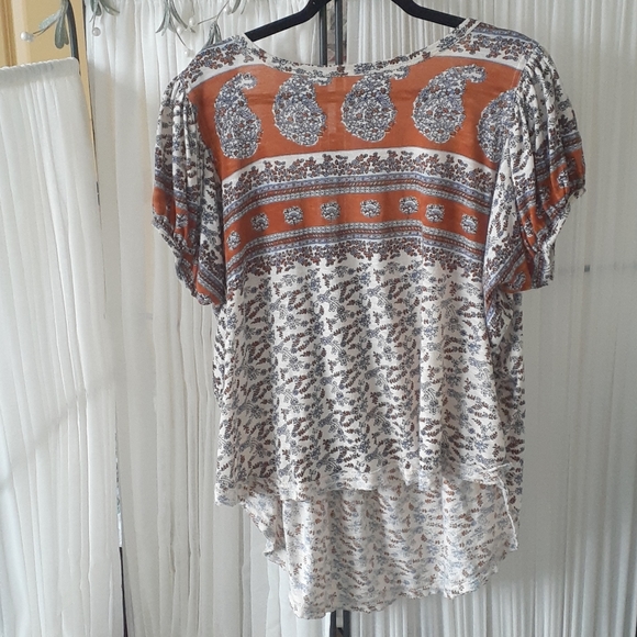 Beautiful Oversized Boho Tee Top from FREE PEOPLE! Rich Color combo. Sooo soft! The back has a lovely, fun & a bit sexy low cut to give it some pizazz 💃🏼 Wear tucked in or long over Jean's,skirts or shorts. *The backside hangs lower than front. New condition - worn 3 times- washes great! Just cleaning closets out after the holidays 🙃 * smoke free, pet free, very clean home❤