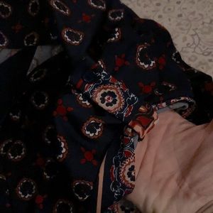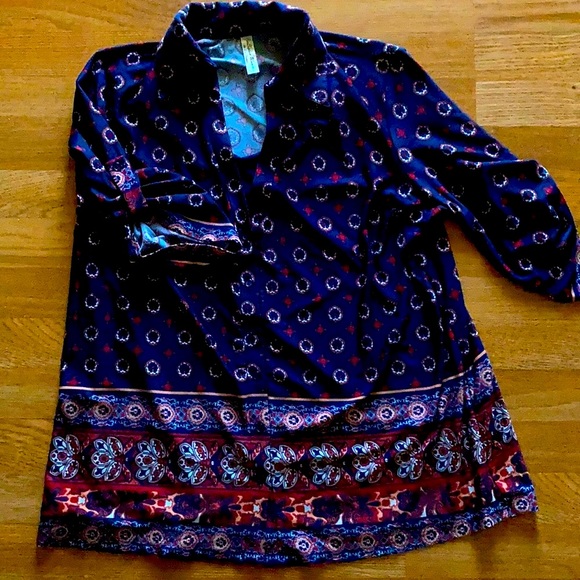 Boho print dark navy blue with rust orange and cream. Has a navy underlay that mimics an undershirt already attached. Short sleeve but are a little longer as they measure almost 10” from shoulder. Pit to pit measures 23” and top of shoulder to bottom hem measures 26”. It is a button up but is stretchy. Size 1X.