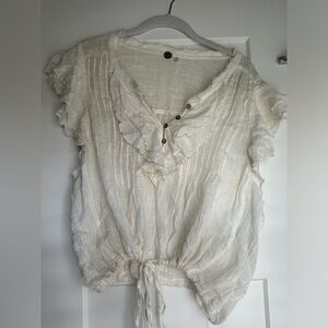 This white blouse features a flutter sleeve design and delicate ruffles that enhance its relaxed style.