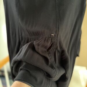 Cute black boho top by World Market. Marked size L/XL. It has batwing sleeves. Tie closure at neckline. There is a small separation at the seam that needs repair on the back (pictured). Otherwise, overall the top is in good condition.