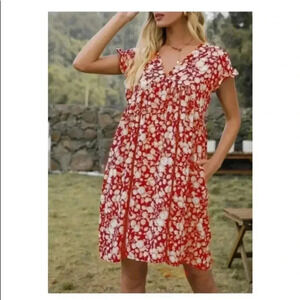 🆕Boho Trendy Red Floral Ruffle-Trim Pocket Shift Dress XL🆕