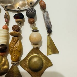 Boho Tribal Statement Necklace Wood Beads Brass Metal Dangles Mixed Media Artsy