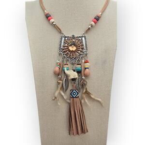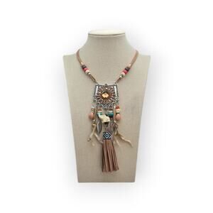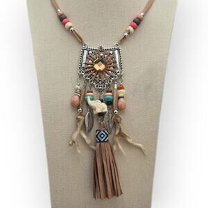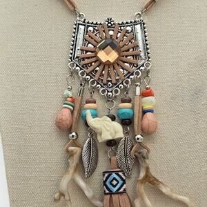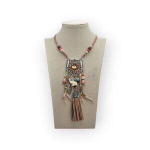 Turn heads with this stunning boho-chic statement necklace! Featuring a detailed geometric pendant with tribal accents, colorful wood and resin beads, faux suede fringe tassel, and sculpted charms including a carved animal figure and metal leaf. The earthy tones and woven textures add a touch of Southwestern flair, making this a perfect accessory for festival season or everyday boho vibes.