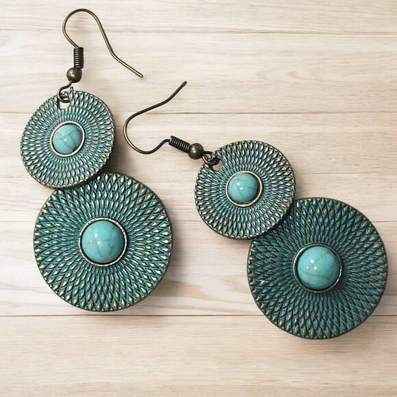 Boho earrings | tribal earrings | turquoise earrings | festival jewelry | western chic | rustic earrings | vintage boho style | dangle earrings | statement earrings | artisan earrings | gypsy earrings | desert fashion | summer accessories | nickel free jewelry | turquoise dangles | antique bronze earrings | artisan look | ethnic earrings | indie jewelry | nature inspired accessories | unique earrings handmade style | spiritual accessories | patina texture earrings | handmade look | bohemian outfit ideas | bold earrings for women | lightweight earrings | eclectic jewelry piece |
