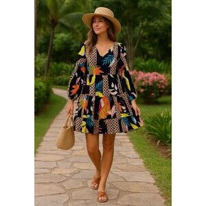 Boho Tropical Floral Geometric Tiered Mini Dress –Long Sleeve Resort Vacation