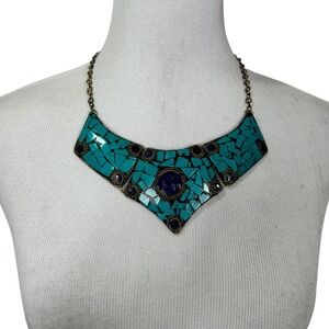 Boho Turquoise Mosaic Collar Necklace Statement. Adjustable clasp closure.