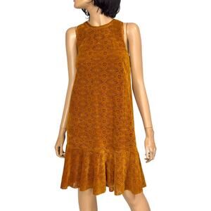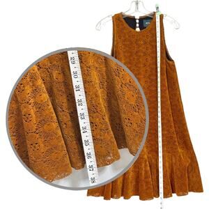 Sleeveless, above knee dress with a preppy drop waist/flounced hemline and keyhole 3-button back closure. Velvet/faux suede cut-out lace fabric with black lining. Relaxed silhouette. Manufacturer color is "Mango" —a coppery cognac brown. Retail $168