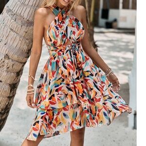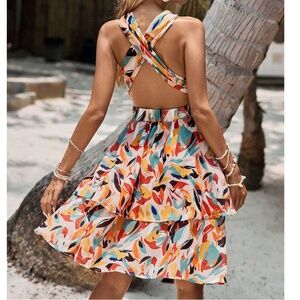 Boho Vibrant Tropical Print Criss Cross Back Ruffle Hem Dress