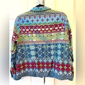 Boho Vintage Christopher Banks Jean Jacket Size Petite Large. Adorable. Great condition. Colorful. 100% cotton. Offers welcomed. Happy Poshing. 🥰
