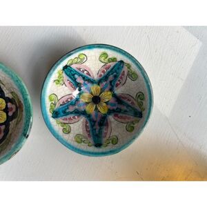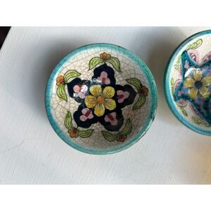 Each dish features vibrant floral and star designs, finished with a rustic crackle glaze that adds old-world character. Perfect for a bohemian home, eclectic altar, jewelry catch-all, or Mediterranean-inspired décor.