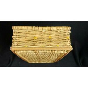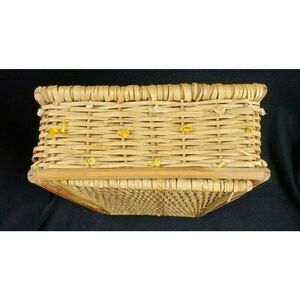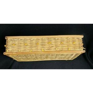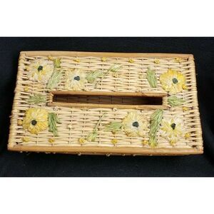 Boho Vintage 70s Wicker Rattan Wood Tissue Holder Box Flowers Cottagecore Decor